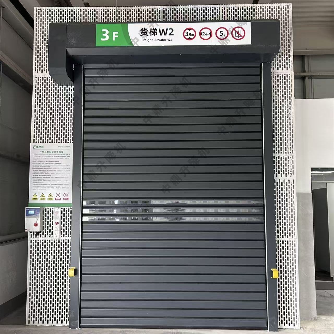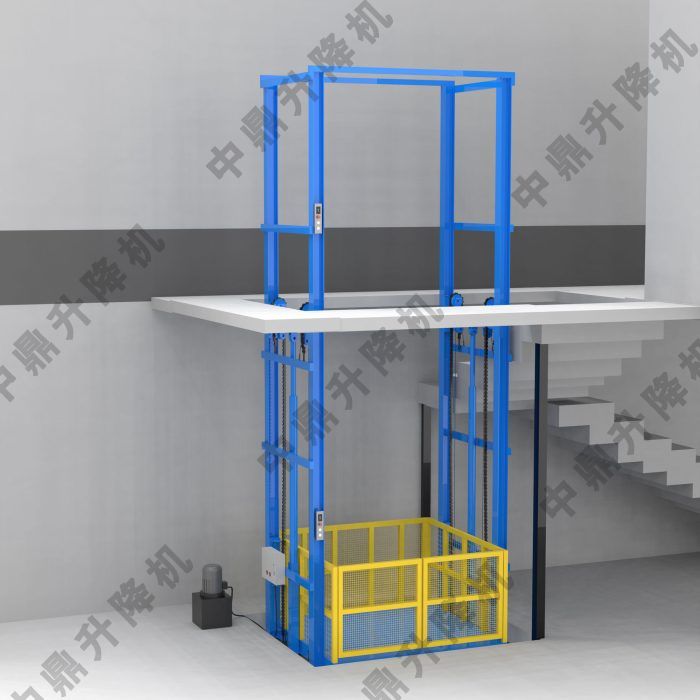 這是一臺導軌式液壓升降貨梯,是工業廠房、倉庫等場所用于樓層間貨物垂直運輸的專用設備。